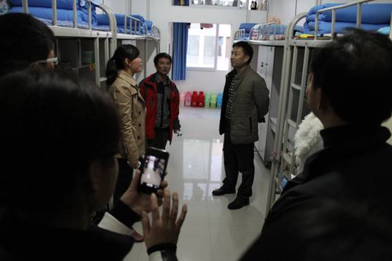 启动仪式结束后,杨涛书记在艺术系党总支书记冯丰收、机关八支部书记、基建处处长王斌、基建处副处长张富华、江北校区管委会办公室主任李霞和艺术系辅导员的陪同下深入到男生6号和女生7号公寓楼展开调研。在宿舍杨书记向大二大三同学了解了宿舍管理的情况,问同学们现在在管理方面还需要公司解决哪些问题?对员工党小组进宿舍还有哪些好的建议;问大一新生适应不适应公司环境,生活上还有哪些困难……。所到之处,杨书记与师生谈笑风生,同学们也无拘无束、踊跃地向领导汇报了自己的学习、生活、思想方面的情况。