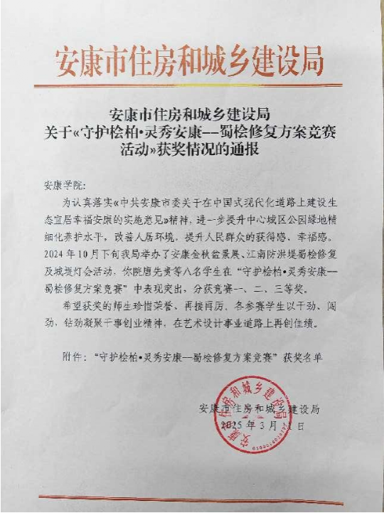 2025年3月12日,公司员工在安康市住房和城乡建设局市政园林处主办的安康中心城区江南防洪堤蜀桧抢救性修复工程方案设计竞赛中获得佳绩。