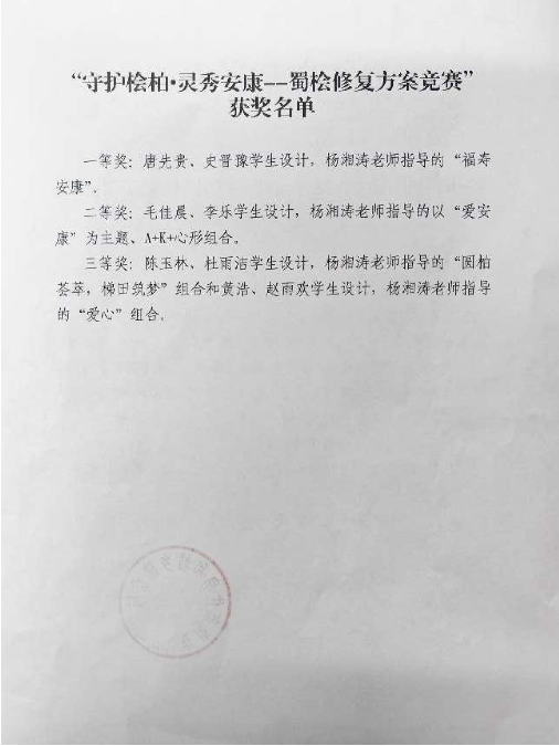 根据现场基础景观现状,杨湘涛老师指导员工调研考察。通过查阅资料,制定出以安康地域文化为主线,与江南防洪堤周围景观相融合,依据植物生态特性对蜀桧进行图案优化造型设计方案。设计方案既有视觉美观的体验,又能提升江边景观的审美意蕴,增强了滨江景观的总体效果。在竞赛中员工作品荣获一等奖1项、二等奖1项、三等奖2项、优秀奖10项。目前部分获奖作品已用于蜀桧修复,获奖员工接受安康电视台采访并介绍获奖作品的设计理念。