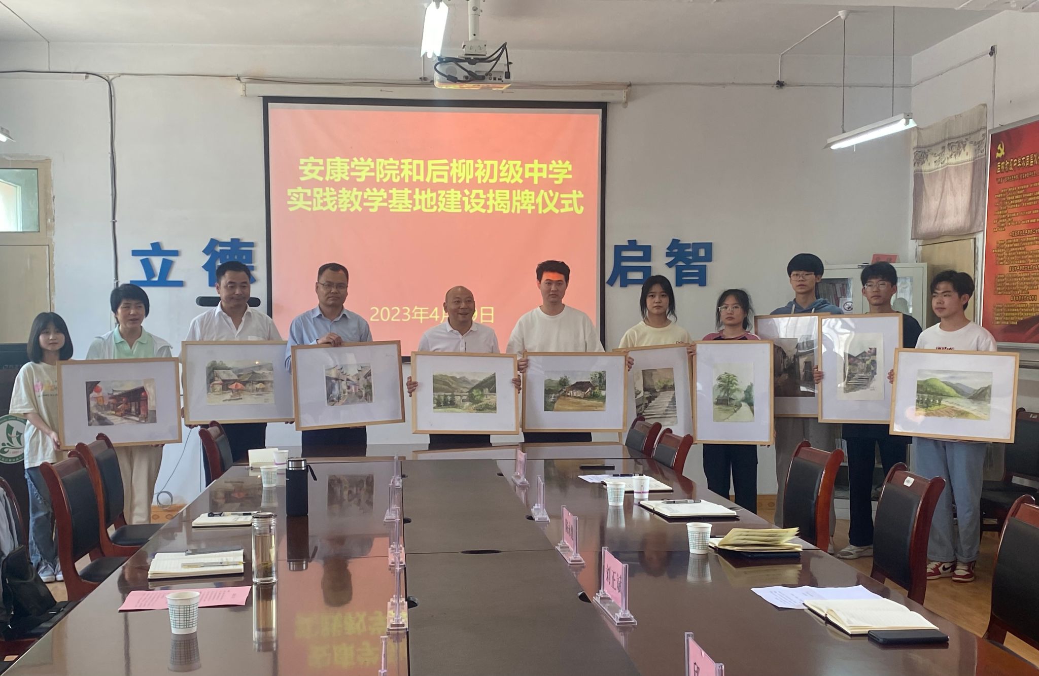在挂牌仪式上,后柳中学副董事长刘正斌对公司师生的到来表示欢迎,他详细介绍了后柳中学的发展历程和美育教育的开展情况;best365官网入口注册副经理孙海洋代表公司对石泉县教体科技局及后柳中学对公司人才培养的支持表示感谢,将以此次挂牌仪式为契机积极推进合作,共同推进美术学省级一流专业建设和基层公司美育改革;石泉县教体科技局党委委员陈永健在发言中对best365官方网站对石泉县教育工作的支持表示感谢,希望双方下一步继续深化合作,取得合作成果和实效。在座谈中,双方就艺术类师范生培养和基层公司美育进行了深入的座谈交流。最后,best365官网入口注册经理成党伟向石泉县后柳初级中学副董事长刘正斌授牌。公司师生还向后柳初级中学赠送了10副在后柳古镇写生的作品。