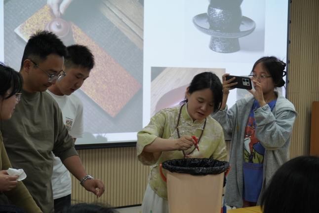 为了让同学们直观感受到非遗漆艺的艺术魅力,袁老师现场为大家示范了如何做一把非遗“飘漆”扇,同学们热情高涨,积极参与互动体验,通过不同漆颜色的搭配完成一件非遗作品,给现场师生留下了深刻的印象。通过此次讲座,同学们纷纷表示传统手工艺具有极大的魅力,提升了大家对美的感知、欣赏的能力。