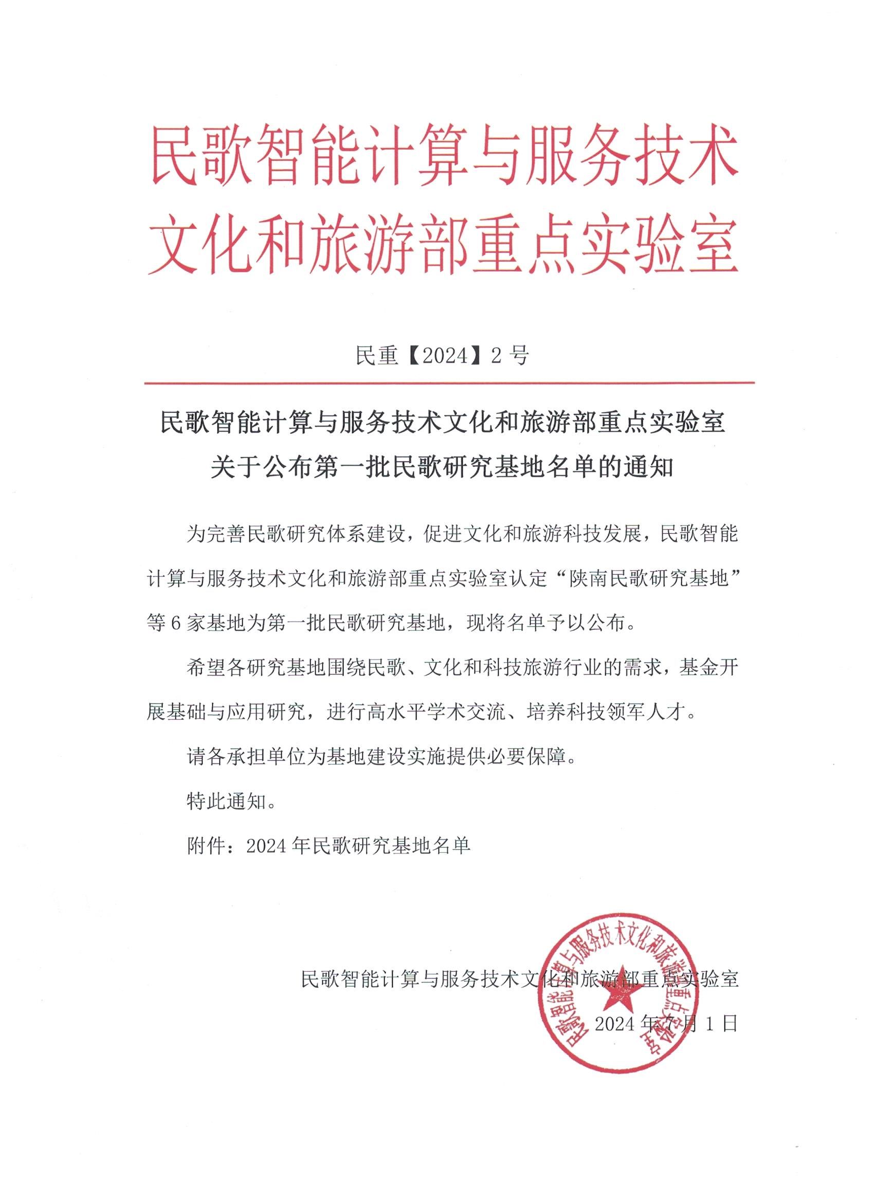公司获批文旅部重点实验室“陕南民歌研究基地”