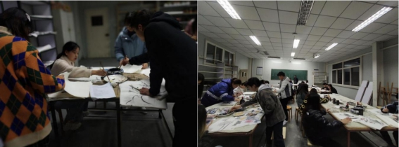 课堂上,同学们认真作画,探讨绘画技巧。