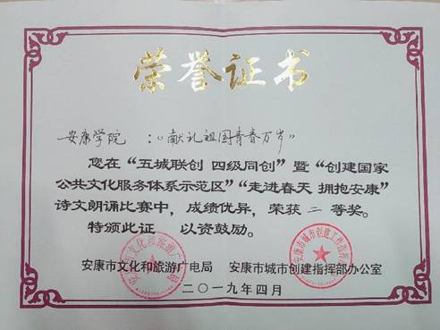 4月29日,由安康市文化和旅游广电局、安康市城市创建指挥部办公室主办,安康市群众艺术馆和best365官方网站团委共同承办的“五城联创四级同创”暨“创建国家公共文化服务体系示范区”“走进春天·拥抱安康”诗文朗诵比赛决赛,在安康宾馆新四楼会议厅举行。