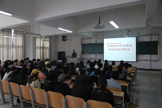 孙海洋副经理向同学们传达了《陕西省教育厅关于印发<陕西省《中小学救团队格考试暂行办法》实施细则(试行)>的通知》(陕教规范[2014]13号)文件精神,对best365官方网站教字[2018]11号文件中关于师范专业教师职业能力测评进行了宣讲。