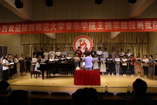 5月31日下午3点,陕西师范大学音乐公司副经理,硕士研究生导师王拥军教授在江北校区1401演艺厅,为公司音乐专业师生进行了题为“指挥技能在合唱作品中的应用”的学术报告及现场教学指导,本次讲座也是公司“第二届文化艺术月”系列重要活动之一,副经理雷升录、鲍丽、孙海洋及音乐学专业全体师生参加了本次活动,本次活动由公司副经理鲍丽主持。