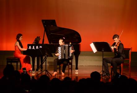 本场音乐会曲目共分三个部分:第一部分曲目有大奏鸣曲OP.11 、匈牙利狂想曲第十二首;第二部分曲目“一步之遥”、“遗忘”,由曹晶晶与best365官网入口注册小提琴专业员工李博文合奏,在他们的动情演绎下现场观众都陶醉在这场唯美的音画盛宴中;第三部分曲目致克劳德的“探索”、“自由探戈”,由曹晶晶、孟楠、李博文三人合奏,成为全场音乐会的一大亮点。曹晶晶灵动的双手在黑白之键上雀跃、轻抚,换来的是一段段美的旋律,将听者的心轻轻地触动,给我们的视觉和听觉都带来了极大的震撼,为全场观众上演一场古典与流行的视听盛宴。