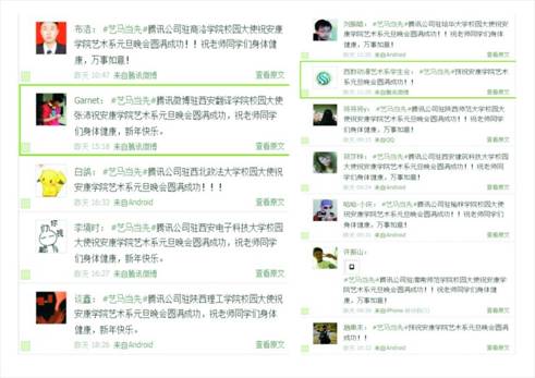 现场腾讯微博互动。我们的晚会得到了腾讯公司的大力支持,在晚会现场,陕西师大、西安交大、西安电子大学等高校通过腾讯微博都纷纷发来贺电,预祝艺术系“艺马当先”元旦晚会圆满成功,这是我们起初没有预想到的,进一步扩大了公司的社会影响,不得不感慨微时代的辐射力和影响力。现场观众的微博互动更为晚会增添许多的乐趣。微博的滚动抽奖也为现场的六名观众带来的新年的幸运。