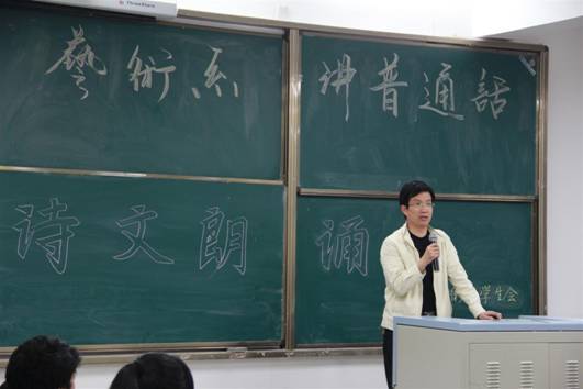 4月15日晚,我系“讲普通话诗文朗诵会”在江北校区2102教室举行。系党总支书记冯丰收、系学工办主任刘泽桢、系员工会干部、2012级员工代表及艺术教育班全体同学参加了诗文朗诵会。