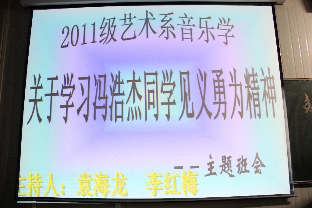 为把“向冯浩杰同学学习”活动推向深入,12月11日晚七点半,我系2011级音乐学专业在1206教室举办了“逝去的青春,不朽的精神——学习冯浩杰同学见义勇为精神”的主题班会。艺术系党总支书记冯丰收、系学工办主任刘泽桢、系团总支书记黄娟、辅导员王毅和系员工会部分同学参加了本次班会。