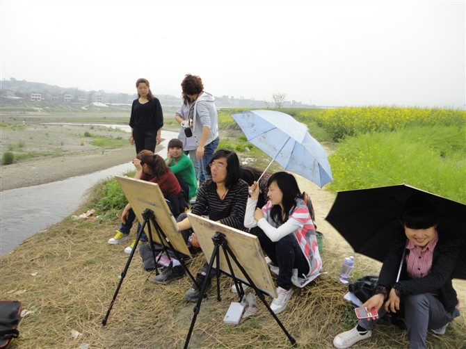 艺术源于生活,并高于生活。为了丰富同学们业余生活,在王毅老师的带领下,他们除了在公司认真学好专业知识外,他们40个人经常在节假日,5个一堆,10个一伙的拿上画板,颜料,再带上几桶水,馒头,鸡蛋等来到田间、乡村写生创作。