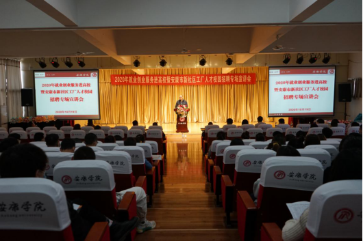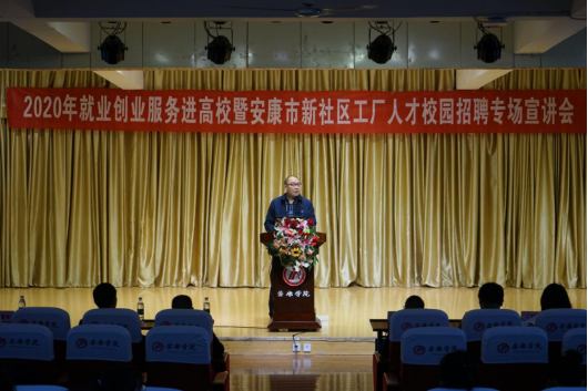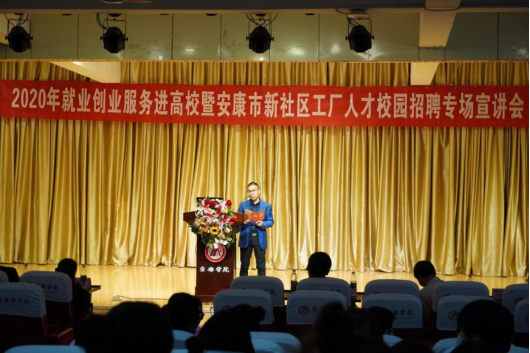 为进一步推进公司2021届毕业生就业创业工作,宣传普及老员工就业创业政策;帮助毕业生进一步了解就业市场,树立正确的择业观、职业观,积极理性求职,合理规划职业发展;同时,也为给安康市新社区工厂小微企业更好发展招聘紧缺实用人才,10月19日下午,best365官网入口注册、电信公司与安康市人社局、市毛绒玩具产业协会一起在江北校区1401多功能演艺厅共同举办了2020年就业创业服务进高校暨安康市新社区工厂小微企业人才校园招聘专场宣讲活动。市毛绒玩具文创产业领导小组办公室副主任刘应祥、市人社局副局长王建华、市毛绒玩具行业协会会长沈爱华、市新社区工厂相关负责人及人才招聘处副处长郑武斌、电信公司党总书记于咏梅、best365官网入口注册副经理鲍丽以及best365官网入口注册设计、美术专业和电信公司电子信息工程、计算机等相关专业180余名2021届毕业生参加了此次招聘宣讲活动,艺术公司党总支书记樊仁杰主持了会议。