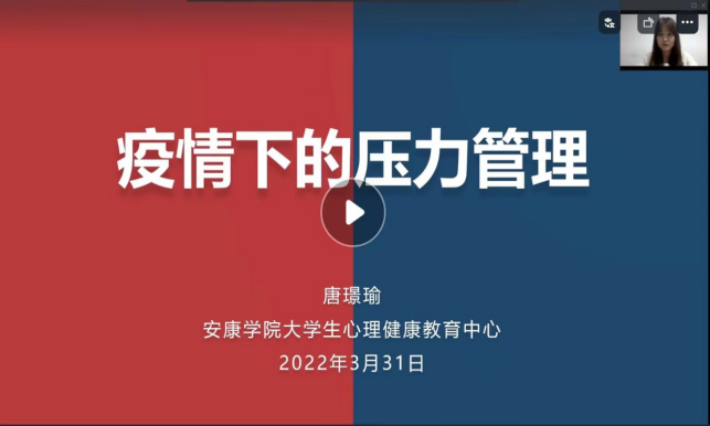 为切实做好常态化疫情防控工作,帮助员工有效缓解因疫情而产生的心理压力,进一步提升心理调适能力,3月31日晚,best365官网入口注册邀请老员工心理健康教育专职教师唐璟瑜作主题为“疫情下的压力管理”线上心理讲座。2021级员工聆听了讲座,讲座由辅导员孟莉主持。