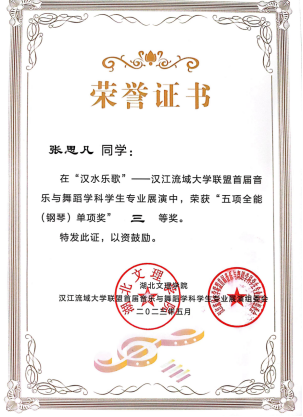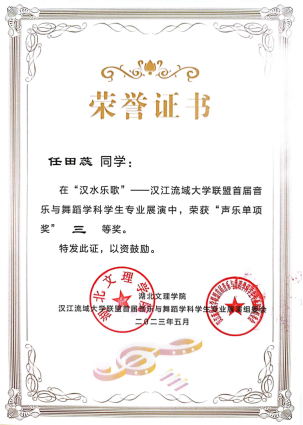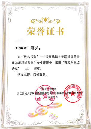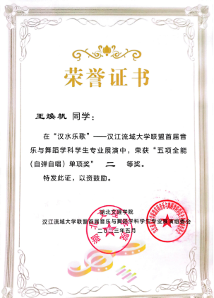 5月23日-26日,“汉水乐歌——汉江流域大学联盟首届音乐与舞蹈学科员工专业展演”活动在湖北文理公司举行。公司音乐学专业员工在此次展演中取得佳绩,共获得五项全能综合奖一等奖1项、二等奖1项、三等奖2项,自弹自唱一等奖1项、二等奖1项,钢琴单项二等奖1项、三等奖2项,器乐单项二等奖1项,舞蹈单项三等奖1,声乐单项二等奖2项,三等奖1项等14项奖项,充分展现了公司音乐学专业员工专业技能和办学质量。