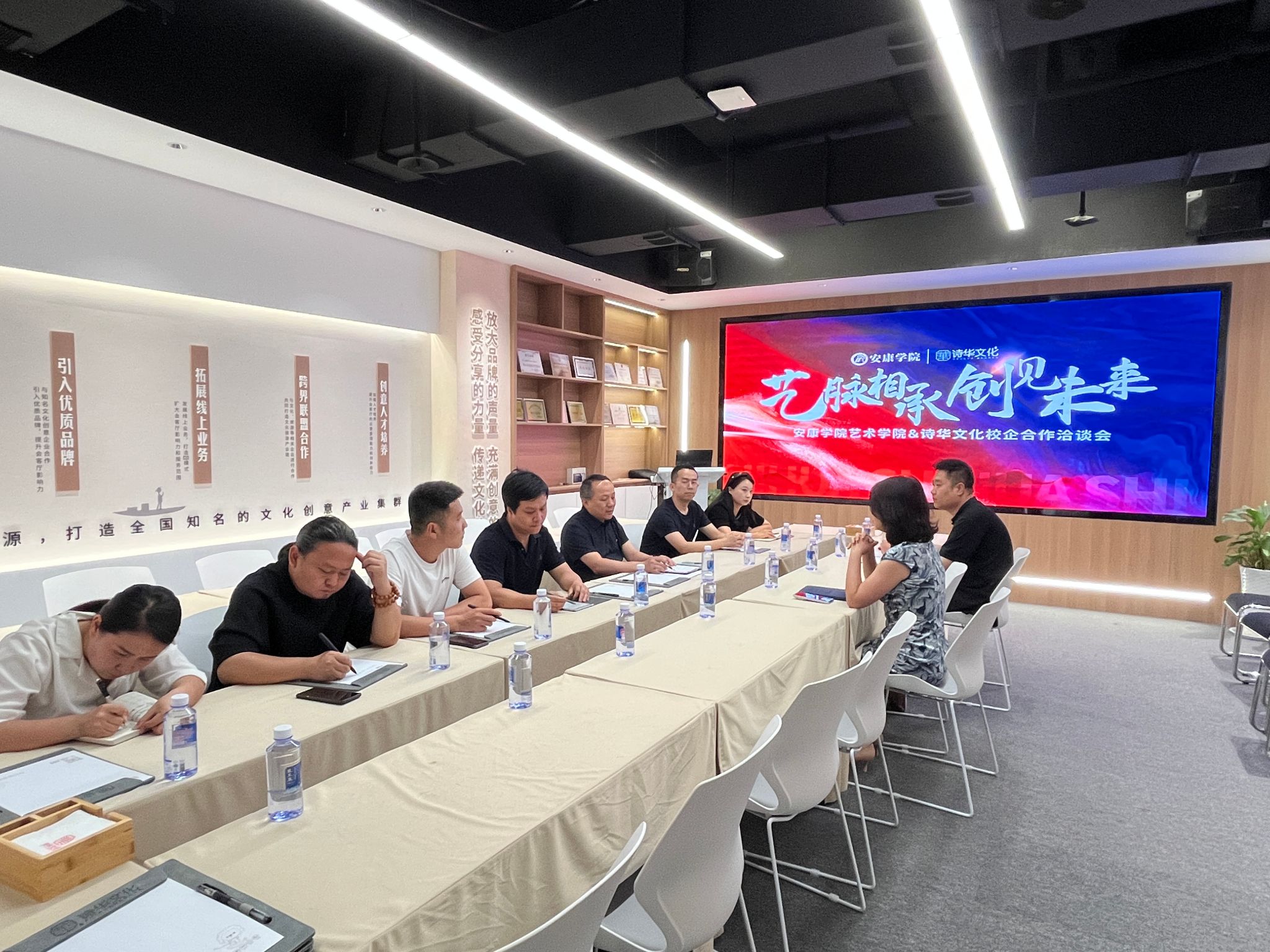 交流活动中,李景林经理介绍了公司在团队建设、人才培养及社会服务等方面的情况。诗华文化总经理陈友群介绍了“安康诗华文化城市文创会客厅”在文化传承、文化创意、文化空间、文化交流和文旅融合等领域发展,提出了企业人才需求,表达了与公司建立深度合作的意愿。双方在人才培养、实践基地建设、员工实习、就业等方面进行了深入的交流,并达成初步共识。