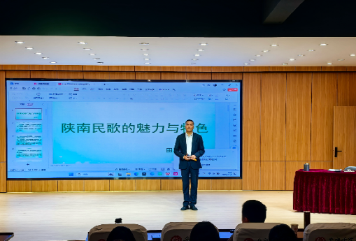 11月8日上午,师生在1401演艺厅聆听了镇巴县文化馆非遗中心主任、国家级非遗项目“镇巴民歌”省级代表性传承人——田洪涛的讲座。讲座从历史渊源、语系、题材等方面对陕南民歌进行总结概括,认为陕南民歌浩如烟海、内容繁多、体裁丰富,真实地反映了陕南人民的历史文化生活,是一部陕南人民历史变迁的活化石。讲座中,田主任对镇巴民歌如数家珍,且讲、唱结合,富有理论研究和实践演唱功底,给大家带来非同一般的享受。