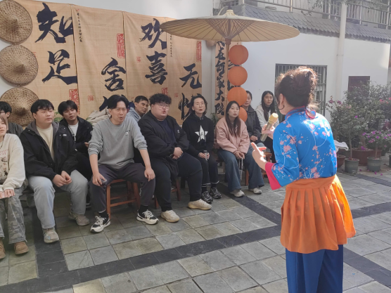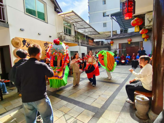 第二站大家来到紫阳民歌传承基地——何家大院,传承人何耀信、何显鹏带领紫阳民歌演唱团队热情地接待了best365官方网站师生一行。民歌演唱队演唱了多首地道的紫阳民歌,引得大家连连叫好。演唱中穿插表演了划旱船、玩蚌壳、赶毛驴等民俗节目。在互动环节,田川老师演唱了《我和我的祖国》,范义付老师演唱了《西部放歌》,还有多名员工演唱了各地民歌,精彩纷呈,使大家大饱耳福。演唱完毕,民歌演唱团队指导员工参与锣鼓队、划旱船、玩蚌壳、赶毛驴等节目表演,员工对紫阳民歌及民俗表演留下了深刻的印象。