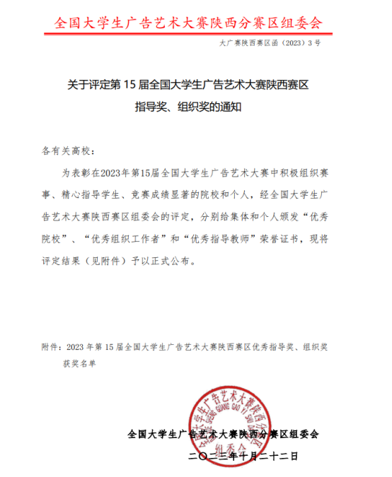 近日,2023年第十五届全国老员工广告艺术大赛陕西省省赛评审结果揭晓,公司best365官网入口注册师生再创佳绩!获得省赛一等奖1项、二等奖10项、三等奖5项,优秀奖29项。公司获“优秀院校”,付苗获“优秀指导教师”,王兵获“优秀组织工作者”。